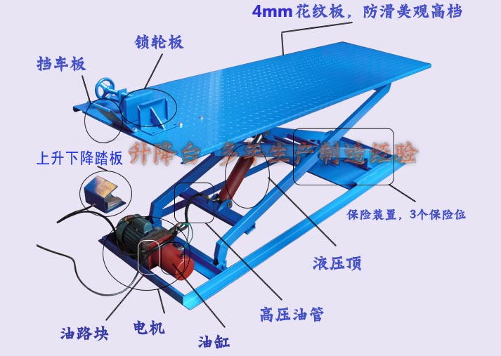 三、一定要把貨物(含手推車(chē)、叉車(chē))放穩(wěn)或鎖定后方可升降,以防升降過(guò)程中出現(xiàn)滑動(dòng)。