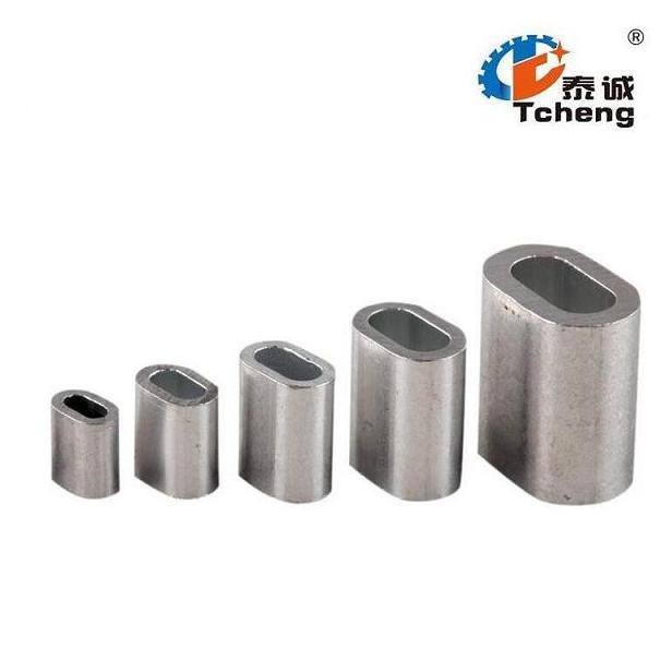 鋼絲繩鋁套—鋁套是鋁材質(zhì)的,較輕,用來固定鋼絲繩兩端的頭的,鋼絲繩根據(jù)需要的掛圈大小,插入鋁套,然后放入壓套機模具內(nèi),(根據(jù)鋁套型號對應壓套機模具,模具型號跟鋁套型號都是標準尺寸),壓制完,把兩邊擠壓出來的鋁廢料清理掉,一根鋼絲繩完成!